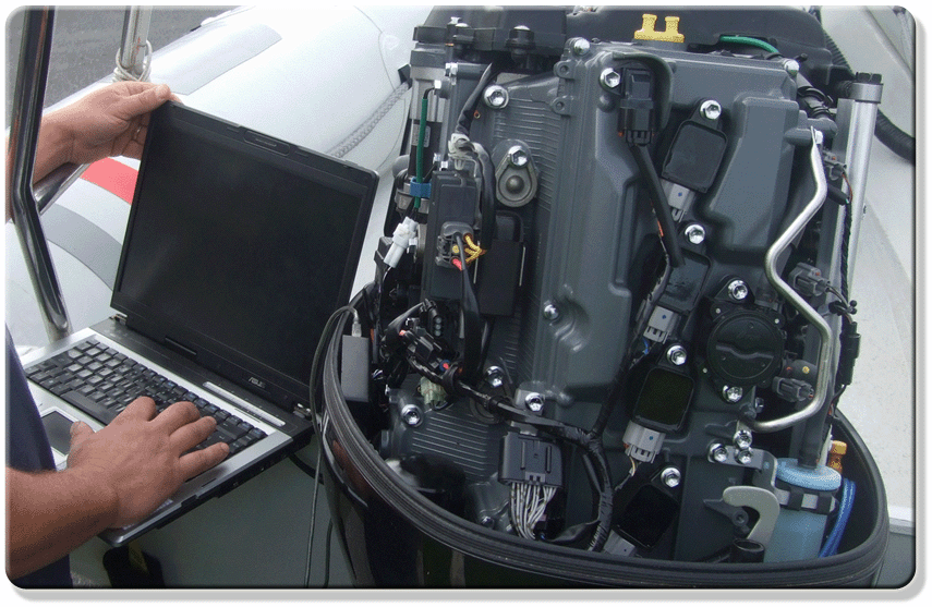 Nautic Inflatables is equipped with full Marine Engine Diagnostic Software. This software allows us to quickly find problems that your engine may have. The key Features with this software are: Check Engine Service History, Check Running Hours, Performs 21 critical test of the complete engine system, from injector testing to verifying the warning horn, Show owner a detailed report of the complete engine system, Fast Fault Finding. This will help to reduce expensive fault finding time. This software can be used with all the leading outboard engine brands from Honda, Yamaha, Selva, Suzuki, Mercury, Mariner, Johnson & Evinrude. With over 20 years experience Nautic Inflatables is your one stop shop for all your outboard servicing needs. |